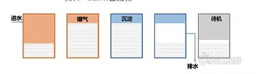 序批式活性污泥法(SBR)工艺是在时间上将厌氧段与好氧段进行分割。20 世纪70 年代初由美国Irvine公司开发。它在流程上只有一个基本单元,集调节池、曝气池和二沉池的功能于一池,进行水质水量调节、微生物降解有机物和固液分离等。经典SBR 反应器的运行过程为:进水→曝气→沉淀→滗水→待机(如图11、12)。
