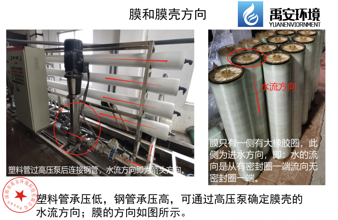 新RO膜安装完成后,应该立即注满干净无氧化剂的水源,用2-4Bar低压冲洗1小时,浓水和产水全部放掉,切勿直接进到二级RO入口或者回到一级RO入口,然后浸泡RO系统12小时以上,待充分润湿后,启动高压泵产水(升压速度 <0.7Bar/秒),但其产水和浓水在头 24 小时内都应该全部放掉,切勿直接进到二级RO入口或者回到一级RO入口。若RO新膜头24小时内的产水直接进到二级RO膜内,可能引起二级RO膜不可逆的通量损失。